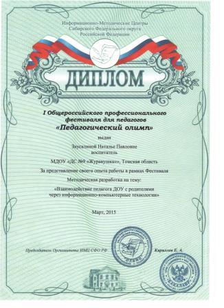 Региональный конкурс «Наш детский сад», Томский областной институт переподготовки работников образования. Диплом лауреата.